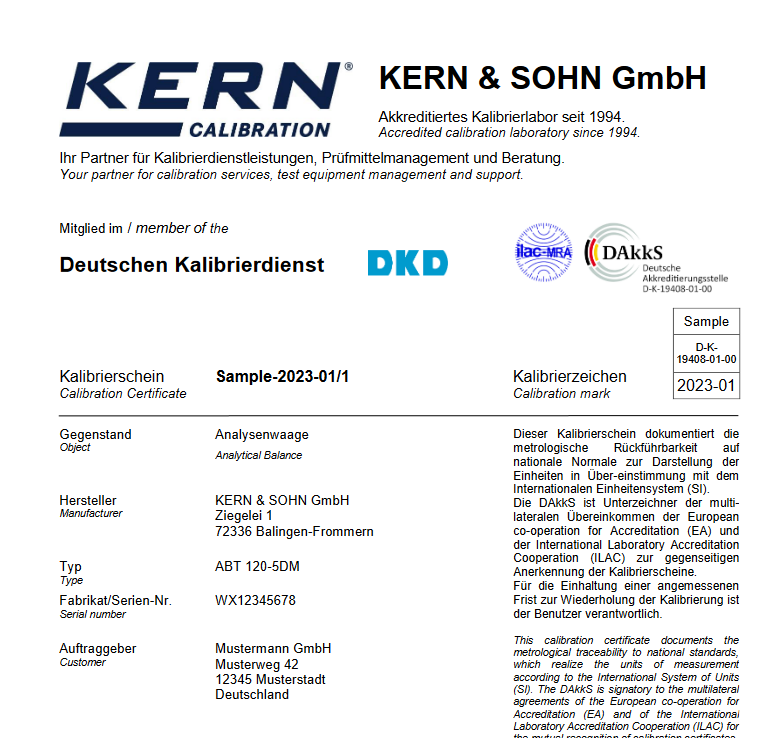 Das DAkkS-Kalibrierlaboratorium KERN (D-K-19408-01-00) ist akkreditiert durch die Deutsche Akkreditierungsstelle GmbH. Der DAkkS-Kalibrierschein wird international anerkannt und ist in vielen Sprachen erhältlich.